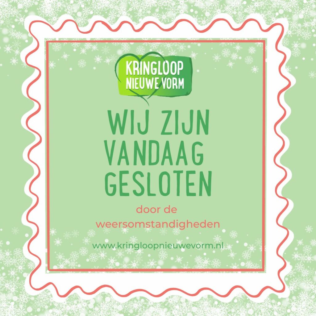 ℹ️ Belangrijke mededeling In verband met de weersomstandigheden blijft Kringloop Nieuwe Vorm vandaag gesloten. We houden jullie via onze socials op de hoogte over hoe het morgen gaat. Dank voor jullie begrip. 💚 Tags# gesloten# nieuwegein# sneeuw# weersomstandigheden Deel dit bericht Vorige Bericht Workshop: Jouw verhaal